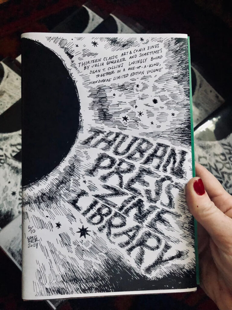 There is one (1) copy of the Thuban Press Zine Library by Julia Gfrörer left available in the world. Hand-made by in a limited edition of 10 and collecting both her best-known and rarest stuff, no two are exactly alike. It’s an S-tier Julia Gfrörer item, a real score if you’re a superfan. Go grab it before it’s gone forever!